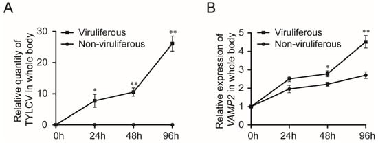 To explore whether the transcription of BtVAMP2 was affected by TYLCV infection, the quantity of virus and the transcription level of BtVAMP2 in the whole body were detected by qPCR. According to the results, with the increase of TYLCV quantity in whiteflies (Figure 3A), the transcription of BtVAMP2 also gradually increased; BtVAMP2 transcription levels were significantly higher statistically in TYLCV-viruliferous than non-viruliferous whiteflies at 48 and 96 h (Figure 3B).