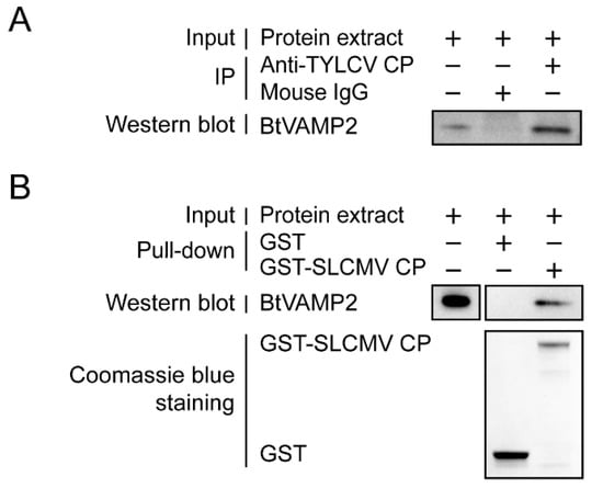 Next, we compared the amino acid sequences of BtVAMP2 in Asia II 1 VAMP2 and MEAM1. The two sequences from different B. tabaci species have a pairwise similarity of 96% (Supplementary Figure S3). We thus examined whether the function of BtVAMP2 in virus acquisition as demonstrated in MEAM1 was conserved in Asia II 1. According to a previous study, Asia II 1 whitefly could effectively transmit SLCMV []. We performed Co-IP and GST pull-down assays to examine the interaction between BtVAMP2 of Asia II 1 and SLCMV CP. Our results showed that the two proteins also interacted with each other (Figure 5A,B).