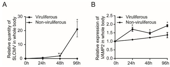 We detected the quantity of virus and the transcription of BtVAMP2 in the whole body of Asia II 1 whiteflies after feeding on SLCMV-infected plants. The results showed that the relative quantity of SLCMV was significantly increased after 48 h acquisition (Figure 6A), and the expression of BtVAMP2 was higher than the one of non-viruliferous whitefly (Figure 6B).