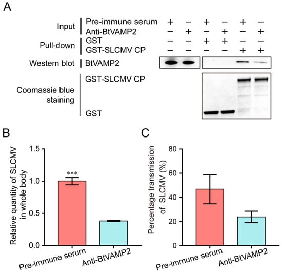 Analyses of the relative quantity of SLCMV in whitefly and the transmission efficiency of SLCMV by whiteflies after antibody treatment. (A) GST pull-down analysis shows that the interaction between SLCMV CP and BtVAMP2 was reduced after anti-VAMP2 rabbit pAb-feeding treatment. (B) After 24 h antibody feeding and 96 h virus acquisition, SLCMV level in Asia II 1 whole body was analyzed by qPCR. (C) Ten female whiteflies were collected and used for virus transmission (independent t-test for (B,C), n = 3, *** p < 0.01).