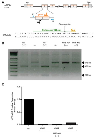 For the generation of CRISPR-Cas9 plasmids, we first modified the pSpCas9(BB)-2A-Puro (PX459) V2.0 (Addgene plasmid # 62988, Addgene, Teddington, UK) [28] to replace the CBh promoter with the EF1 alpha promoter by a subcloning strategy. The modified plasmid was named cAB03 (i.e., pX459-pEF1 alpha), and further used to produce two distinct plasmids, each containing a single guide RNA specific to the MMP24 sequence (i.e., sgRNA containing crRNA + TracrRNA), aiming at generating insertions and deletions within the exon 2. To that end, CRISPR sgRNAs were designed using the Zhang lab design tool (http://CRISPR.mit.edu, accessed on 28 June 2021) and cloned into cAB03 as previously described [28]. For the sgRNA, a 20 nt MMP24 specific sequence was selected, sgRNA1: GATCCCGGTCACCGGTGTGT. Briefly, the selected MMP24 specific sequence was cloned by BbsI-mediated digestion of cAB03, followed by ligation using cohesive end cloning. Plasmids were transformed into DH5α chemically competent cells (Thermo Fisher Scientific, Waltham, MA, USA) and individual clones were first screened by PCR to verify the insertion, then were ultimately validated by sequencing analysis.
