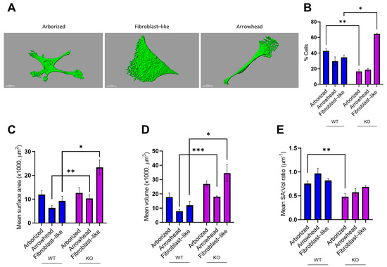 We next sought to evaluate MT5-MMP knockout effects on the most abundant neural cell type in the human brain, namely, astrocytes. To evaluate astrocyte features independently of neurons, hiPSCs were differentiated using a previously published protocol [32], with minor modifications. For both genotypes, we observed heterogeneity in cell morphology of the astrocyte-like cultures. Using the previously published method [33], we determined and binned all cells into three morphological categories for further analysis: fibroblast-like, arborized, and arrowhead (Figure 5A). Detailed analysis showed differences in the proportion of astrocytes falling into each category between genotypes, suggesting that MT5-MMP deficiency could have an impact on astrocyte morphology (two-way repeated ANOVA with Sidak’s post hoc test, N = 3, n = 245, F (2, 8) = 38.7, p < 0.001). The comparison of morphotypes between genotypes showed that the proportion of “arborized” astrocytes was higher in wild-type astrocyte-like cultures (WT 53/131 vs. KO 14/114, p < 0.01), meanwhile, the number of fibroblast-like cells was higher in MT5-MMP-deficient cultures (WT 38/131 vs. KO 76/114, p < 0.05) (Figure 5B). A 3D IsoSurface reconstruction from serial confocal z-stacks of GFAP cells, as well as the quantification of cell surface area (SA), cell volume (Vol) and the SA:Vol ratio, revealed significant differences in cellular morphology (Figure 5C–E). Analysis of the genotype effects for each of the morphotypes (nested t-test, N = 3, n = 73; arborized, n = 33, F = 0.013, p = 0.92; arrowhead, n = 24, F = 12.5, ** p = 0.002; fibroblast-like, n = 16, F = 13.8, * p = 0.02) revealed that arrowhead and fibroblast-like MT5-MMP KO astrocytes were characterized by a bigger surface area in comparison to WT astrocytes of the same morphotype (Figure 5C). Quantification of cell volume revealed significant differences between genotypes (nested t-test, N = 3, n = 73; arborized: n = 33, F = 3.55, p = 0.13; arrowhead: n = 24, F = 13.8, *** p < 0.001; fibroblast-like: n = 16, F = 8.98, p = 0.04). MT5-MMP KO astrocytes were characterized by increased volume for arrowhead (*** p < 0.001) and fibroblast-like (* p < 0.05) astrocytes, in comparison to WT ones (Figure 4D). However, the SA:Vol ratio was higher for arborized WT compared to MT5-MMP KO astrocytes (nested t-test, N = 3, n = 73; arborized: n = 33, F = 9.60, ** p = 0.004; arrowhead: n = 24, F = 4.75, p = 0.09; fibroblast-like: n = 16, F = 4.08, p = 0.06, Figure 5E).
