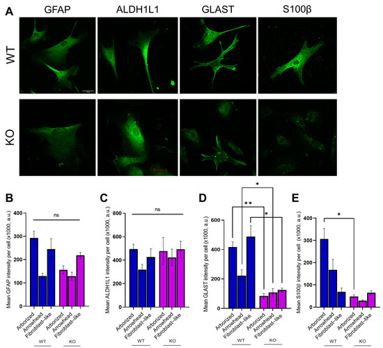 Astrocytes at the final stage of differentiation (45 DIV) exhibited the expression of astroglia-specific markers—GFAP, GLAST, ALDH1L1, and S100B (Figure 6A). Quantification of the fluorescence intensity of GFAP+ (nested t-test, N = 3, n = 245; arborized: n = 67, F = 3.92, p = 0.12; arrowhead: n = 64, F = 0.381, p = 0.57; fibroblast-like: n = 114, F = 0.433, p =0.55) and ALDH1L1+ cells (nested t-test, N = 3, n = 121; arborized: n = 36, F = 0.04, p = 0.85; arrowhead: n = 30, F = 1.86, p = 0.24; fibroblast-like: n = 55, F = 0.746, p = 0.44) revealed no difference in intensity between genotypes (Figure 6B,C). However, analysis of GLAST showed significantly decreased intensities for all three morphotypes of MT5-MMP KO astrocytes, compared to WT cells (nested t-test, N = 3, n = 181; arborized: n = 57, F = 31.2, ** p = 0.005; arrowhead: n = 32, F = 5.80, * p = 0.02; fibroblast-like: n = 92, F = 14.0, * p = 0.019, Figure 6D). Finally, analysis of S100β intensity showed significant difference between arborized MT5-MMP-deficient and wild-type astrocytes of the same morphotype (nested t-test, N = 3, n = 139; arborized: n = 49, F = 9.67, p = 0.04; arrowhead: n = 42, F =1.48, p = 0.07; fibroblast-like: n = 48, F = 0.05, p = 0.83, Figure 3E).