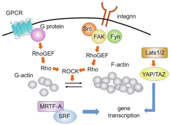 The activities of Lats1 and Lats2 are regulated by the actin cytoskeleton, which is regulated by Rho. Rho is also involved in the MRTF-A- and MRTF-B-mediated fibrotic pathway. MRTF-A and MRTF-B help serum response factor (SRF) to bind a promotor sequence known as the serum response element (also known as the CArG box). Rho activates the transcriptional machinery, leading to fibrotic responses. Thus, Rho, Lats1/2, YAP, and MRTF-A/B form a complex network of induction of fibrotic responses.