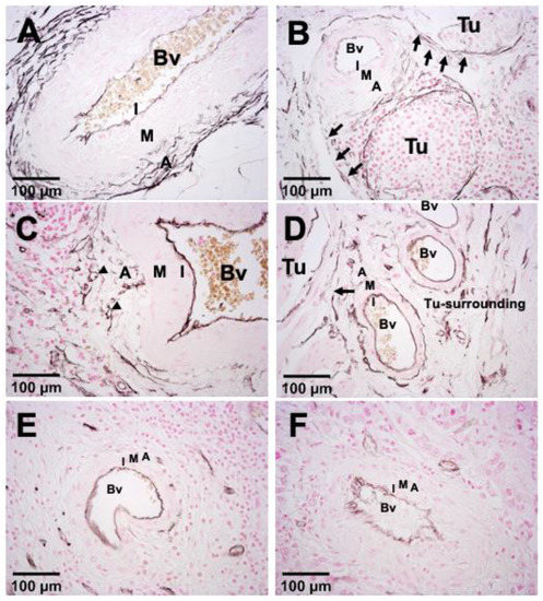 Mobilization of adventitia-resident CD34+ cells in tumors. Stepwise mobilization of adventitial CD34+ cells in human bladder cancer (A–F). Artery in the normal, non-transformed tissue surrounding the tumor: a clear, stable CD34+ zone is discernible in the adventitia (A). Blood vessel (Bv) in close vicinity to the tumor (Tu): CD34+ cells are partially detached from the adventitia, migrating towards the tumor area (arrows), forming small vessels (arrow heads) (B,C). Tumor surrounding area without invasion of tumor cells: CD34+ cells are still detectable in the entire adventitia of the blood vessels (D). Blood vessels that are fully enclosed by the tumor: the adventitia is depleted of CD34+ cells (E,F). Abbreviations: Bv—blood vessel; Tu—tumor; I—vascular intima; M—vascular media; A—vascular adventitia.
