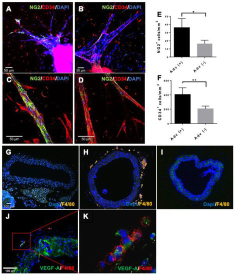 To further explore the role of the adventitia on vascular sprouting, we studied the immunophenotype of the cells involved in the sprout morphogenesis in ARs with and without adventitia. These analyses revealed that sprouts from ARs with adventitia left in place display a high number of NG2+ cells that are associated with capillary-like sprouts (Figure 3A), while sprouts that were formed in the absence of the adventitia showed significantly reduced coverage by NG2+ cells (Figure 3B). Moreover, in the presence of the adventitia, NG2+ cells enwrapped the endothelial sprouts from the outside in a pericyte-like manner (Figure 3C). In contrast, the fewer NG2+ cells that were detected in the absence of the adventitia showed a more irregular coverage of sprouts, e.g., not sufficiently flattened and not appropriately attached to the endothelial cells (Figure 3D). These data suggest that vascular adventitia-derived VW-SPCs contribute to the generation of NG2+ cells, which in turn contribute to the maturation, stabilization, and network formation of capillary-like sprouts (Figure 3E). Besides the NG2+ cells in this study, adventitia has been shown to also be a source for CD34+ cells (Figure 3F).
