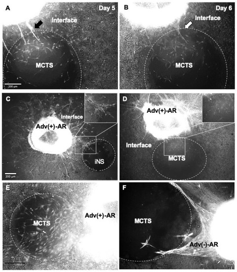 In the interface area between AR and MCTS, single cell sprouts formed capillary like structures that were maintained until day 5 (Figure 5A), but after day 5 (Figure 5B) they started to disappear, apparently due to their resolution into single cells again. To investigate the differences between the vascularization in the tumor microenvironment and vessel formation in normal tissue, we performed the confrontation culture of AR-MCTS co-culture (Figure 5C,D) parallel to AR with iPS-derived neural spheroids (iNS; Figure 5C). In AR-iNS, the capillary sprouts penetrated directly into the iNS (Figure 5C), while in the AR-MCTS-culture the sprouts remained at the MCTS border (Figure 5D). Next, we wanted to better characterize the relation of adventitia-derived VW-SPCs to MCTS, and thus performed an AR-MCTS-confrontation culture using ARs with and without aortic adventitia in place. In comparison with the co-culturing of MCTS with ARs containing an adventitial layer, where a high number of GFP+ cells that originate from the ARs of GFP mice penetrated into the MCTS (Figure 5E) in the co-culturing of MCTS, with ARs without an adventitial layer, only a few GFP+ fluorescently labeled cells were observed within the MCTS. The majority of mobilized GFP+ cells encircled the MCTS spheroids, covering them from the outside (Figure 5F).