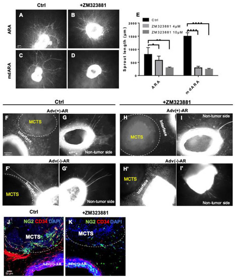 Finally, we examined the effect of pharmacological angiogenesis inhibitors in our tumor−vessel wall interface model. We first used ZM323881, a potent VEGF-R2 inhibitor, which is in contrast to the approved anti-angiogenic TKIs highly selective for VEGF-R2, with a low to negligible affinity for VEGF-R1, -R3, or PDGFRs. Based on the data from the literature, ZM323881 was applied at 4 µM and 10 µM to ARs with the adventitia left in place versus ARs without the adventitial layer [14,15,16]. Treatment with ZM323881 resulted in a clear reduction in the number and length of capillary sprouts under both conditions (Figure 6A–D). However, the effect was considerably stronger when the aortic adventitia was removed (Figure 6E). Remarkably, the sprouting of single cells from the ARs with adventitia was not significantly inhibited under treatment with ZM323881. We then applied ZM323881 in the confrontation culture with MCTS (Figure 6F–I’). In comparison with the corresponding controls (Figure 6F–G´), ZM323881 treatment suppressed the capillary-like sprouting (Figure 6H–I´). Again, we observed a strong sprouting of individual cells into the tumor−aortic wall interface, as well as into the non-tumor side, indicating that a considerable part of the mobilization of cells from the aortic rings is not related to VEGF-R2 signaling. Immunofluorescence staining showed that ZM323881 specifically inhibits the mobilization of CD34+ cells, while NG2+ cells continued to migrate and also to penetrate into the spheroids (Figure 6J,K). To conclude the evaluation of inhibiting the VEGf pathway, we tested the effect of axitinib, an anti-angiogenic TKI approved for the treatment of renal cell carcinoma. Axitinib was applied to the tumor−vessel interface model at 4 µM [17]. At this concentration, axitinib completely blocked cell mobilization from both the AR and the MCTS (Figure S4). This also included the cell types not affected by ZM323881. The more drastic effect could be attributed to the fact that axitinib also inhibits PDGFRs and cKIT.