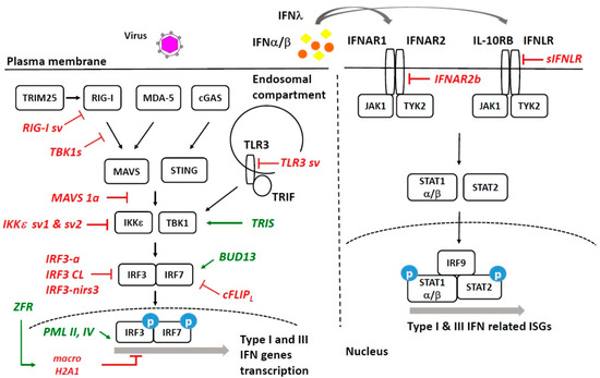 Alternative splicing in the host Type I and Type III IFN response. AS isoforms that upregulate the antiviral response are shown in green, and those that downregulate the antiviral response are shown in red.