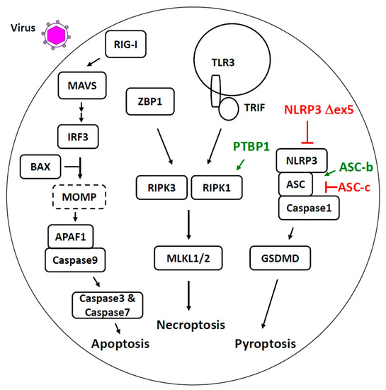Pyroptosis, which is also an inflammatory form of cell death, is induced by inflammasome activation and is critical for the antiviral response [89,90]. This death pathway is initiated by the detection of PAMPs or danger-associated molecular patterns (DAMPs) by inflammasome proteins, most of which are members of the Nod-like receptor (NLR) family [91]. Subsequently, the recruitment of adaptor apoptosis-associated speck-like protein containing a CARD (ASC) and caspase 1 forms an inflammasome protein complex. Activated caspase 1 would cleave gasdermin D (GSDMD), releasing the GSDMD-N domain. The GSDMD-N domain translocates to the plasma membrane and oligomerizes to generate membrane pores. This pore formation disrupts the osmotic potential, resulting in cell swelling and eventual lysis. In addition, active caspase-1 processes pro-IL-1β and pro-IL-18 to bioactive forms, promoting inflammation. Among many NLRs, NLR family pyrin domain containing 3 (NLRP3) is important in antiviral response [89], and it was recently shown to be regulated at the splicing level. A novel NLRP3 spliced variant that lacks exon 5 encodes a fraction of the LRR domain [92]. Deletion of this region abolishes its interaction with the NIMA-related kinase 7 (NEK7) protein, the binding of which is a prerequisite of NLRP3 activation, and thus makes NLRP3 ∆exon5 inactive. Another critical component in the inflammasome is the adaptor ASC, composed of an N-terminal PYD domain for association with the NLR proteins, a linker region, and a C-terminal CARD domain for interaction with the caspase proteins. A spliced variant of ASC-b lacks exon 2, encoding the linker, and is able to activate NLRP3 inflammasome [93]. In line with this, a patient harboring this ASC exon 2 deletion exhibits a higher level of IL-1β protein in the serum [94]. Another spliced isoform ASC-c has a deletion in the PYD domain. It acts as a dominant negative regulator and reduces NLRP3 activation [93].