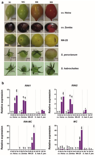 RIN1i, RIN2i, RIN–MC, and MC mRNA expression in the fruit of Solanum lycopersicum, its rin/RIN genotype, and wild tomato species. (a) Fruit images at different ripening stages; scale bar = 1 cm. (b) Quantitative expression analysis by qRT-PCR. NN-25, the rin/RIN genotype; S. habr., S. habrochaites; S. per., S. peruvianum; IG, immature green; MG, mature green; Br, breaker; RR, ripe red; RF, ripe final. Lowercase letters above the bars indicate statistically significant differences (p < 0.005) between gene expression in different tissues of the same accession: IG, a; MG, b; Br, c; RR (RF), d. For example, the gene expression in IG fruit was significantly different from that in other fruit, which is denoted by letters “bcd” above the bar.