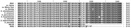 Alignment of the C-termini of RIN1 isoforms from S. lycopersicum cultivars, and wild GF species. NN-25, the product of the NN-25 rin allele; RIN2, S. lycopersicum cv. Heinz RIN2 isoform.