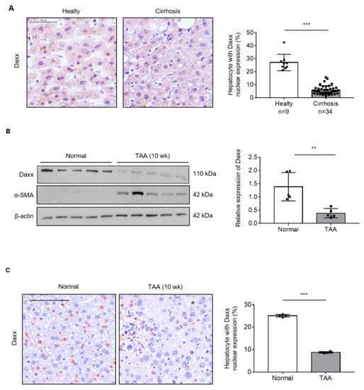 To determine the role of Daxx in liver fibrosis, we assessed Daxx expression in human healthy (n = 9) and cirrhotic liver (n = 34) tissues using TMA. The IHC data showed that Daxx was most abundantly expressed in the nuclei of hepatocytes; thus, we counted Daxx-positive hepatocytes nuclei from total hepatocyte nuclei and calculated them as a percentage. The result of our experiment demonstrated that Daxx-positive cells were reduced in cirrhotic liver tissues compared to healthy tissues from human livers (Figure 1A). Then, we assessed the expression of Daxx in a TAA-induced fibrotic liver mouse model using Western blotting and IHC. Western blotting analysis showed that Daxx expression was dramatically decreased in the liver of TAA-induced fibrotic mice, with high expression of the fibrosis marker, α-smooth muscle actin (α-SMA) compared to normal mice liver. (Figure 1B). Furthermore, IHC staining of Daxx showed that Daxx was most expressed in the nuclei of normal mouse hepatocytes, as shown in Figure 1A, and that its expression was decreased in TAA-treated fibrotic mouse hepatocytes. Therefore, we counted and quantified the cells expressing Daxx in the nucleus. The quantification graph showed that the Daxx-positive cells were decreased by approximately 80% in fibrotic livers compared to normal livers (Figure 1C). These results clearly showed that Daxx expression was reduced in the nuclei of hepatocytes in fibrotic livers compared to normal livers and it can be expected that Daxx is associated with liver fibrosis.