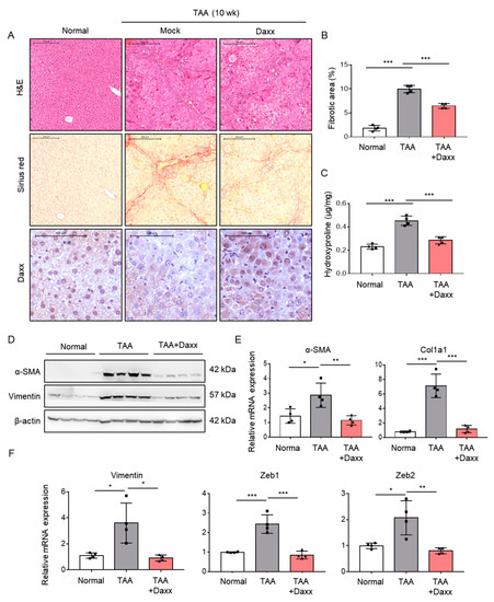 To directly evaluate the role of Daxx in liver fibrosis, we restored Daxx expression in an animal model of TAA-induced liver fibrosis. Mice injected with TAA were administered pHA-Daxx by a hydrodynamic gene delivery system. The quantification of Sirius red staining showed that the collagen deposition area was decreased by approximately 40%. The amount of hepatic hydroxyproline was significantly reduced in pHA-Daxx-treated mice compared to TAA-injected mouse livers (Figure 5A,B). In addition, Western blotting analysis indicated that the expression of α-SMA, which was upregulated after TAA administration, was suppressed when Daxx expression was restored (Figure 5C). Additionally, the mRNA levels of the fibrosis-related genes α-SMA and Collagen type 1 (Col1a1), as well as the EMT-related genes Vimentin, Zeb1 and Zeb2, were suppressed in the Daxx-injected mouse group compared to the TAA-injected mouse group (Figure 5D,E). These results demonstrate that the presence of Daxx expression ameliorates the pathological changes associated with fibrosis progression in the liver (Figure 6).
