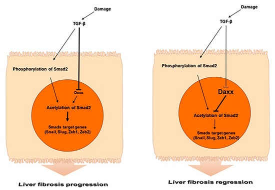 In summary, we demonstrated that Daxx plays a pivotal role in TGF-β-induced hepatocyte EMT by inhibiting Smad2 acetylation and phosphorylation during liver fibrosis. Accordingly, Daxx may be a potential therapeutic target for preventing and treating liver fibrosis.