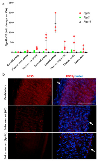 Analysis of the Rgs5 expression in different types of mouse arteries. (a) qPCR analyses were performed to determine the relative expression levels of Rgs5, Rgs2, and Rgs16 in different arteries of adult C57 BL/6 mice as compared to the carotid artery as a reference (set to 1). Expression of the housekeeping gene Rpl32 was used as internal reference (n = 3). Note that the overall expression levels of Rgs2 and Rgs16 are much lower as compared to Rgs5. (b) RGS5 was detected by whole mount immunofluorescence-based techniques (red fluorescence) in the caudal artery (upper panel) and 3rd order branches of the mesenteric artery of WT and Rgs5−/− mice. The images represent the maximum fluorescence intensity projection of a Z-stack generated by confocal microscopy including all layers of the corresponding arteries. VSMCs can by identified by their circular orientation (scale bar: 100 µm, arrows point at nuclei located in the adventitial layer).