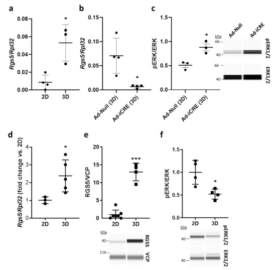 VSMCs cultured in 3D spheroids display higher RGS5 levels and low ERK1/2 activity. (a–c) aoSMCs were isolated from the aortas of Rgs5fl/fl mice and cultured as monolayer (2D) or spheroids (3D) for 48 h. (a) Rgs5 expression was analyzed by qPCR with Rpl32 as a reference (* p < 0.05, n = 3–4). (b) Knockout of Rgs5 in aoSMCs was achieved by adenoviral transduction to overexpress Cre-recombinase (Ad-iCRE, control vector: Ad-Null) and verified by qPCR of RNA collected from 3D spheroids (* p < 0.05, n = 4). (c) Phosphorylation of ERK1/2 was significantly increased in 3D spheroids upon Rgs5 knockout (* p < 0.05, n = 3). (d–f) HUASMCs were cultured as (2D) monolayer or 3D spheroids. (d) RGS5 expression was determined by qPCR with Rpl32 as internal reference (* p < 0.05, n = 3–5). (e) Capillary electrophoresis-based immunodetection of RGS5 and VCP as loading control (*** p < 0.001, n = 4–7) or (f) phospho-ERK1/2 and total ERK1/2 as reference (* p < 0.05, n = 4).