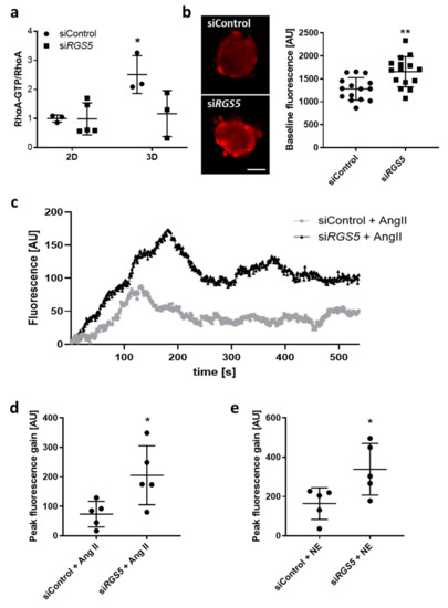 Loss of RGS5 inhibits RhoA-activity and elevates calcium levels in human VSMC spheroids. RGS5 was depleted in HUASMC using siRNA-mediated transfection. Cells were further cultured as either monolayer (2D) or spheroids (3D). (a) Analysis of RhoA-GTP/RhoA applying a RhoA G-LISA. Total RhoA protein levels were determined using immunoblot-based techniques (* p < 0.05 vs. siControl, n = 3–5). (b–e) Three-dimensional (3D) spheroids were loaded with Rhodamin-4 to monitor the calcium-triggered change in fluorescence. (b) Representative image and corresponding quantification of the baseline calcium levels in HUASMC spheroids upon knockdown of Rgs5 (** p < 0.01, results of 15 spheroids per group, scale bar: 50 µm). (c) Representative recordings of the angiotensin II (Ang II)-induced change of the fluorescence in spheroids upon knockdown of Rgs5 vs. control conditions. (d,e) Corresponding quantification of the peak fluorescence gain (vs. baseline) in 3D spheroids (* p < 0.05, n = 5) upon treatment with Ang II or norepinephrine (NE).
