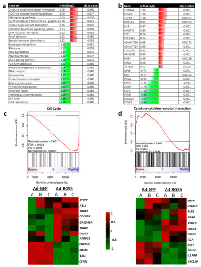 RGS5 overexpression in human VSMCs induces cellular quiescence. RNA from HUASMCs overexpressing GFP (Ad-GFP) or RGS5 (Ad-RGS5) was subjected to transcriptome applying a whole genome microarray (n = 3). (a) GSE analyses were performed by clustering genes in sets from the KEGG database pathways. The table lists gene sets which were significantly up- (shown in red) and down-regulated (shown in green) upon RGS5 overexpression with normalized enrichment score (NES) > 2.0/<−2.0 and adjusted p-value (adj. p) < 0.05. (b) List of individual top-regulated genes (red: upregulated, green: downregulated, RGS5 vs. GFP, selection criteria: log2-fold regulation >0.5/<−0.5; adjusted p-value (adj. p) < 0.05). (c,d) Representative enrichment score plots are shown for cell cycle- and cytokine-associated gene sets (NES: normalized enrichment score, adj. p: adjusted p-value). Heatmaps display the sample-specific regulation of exemplary genes attributed to these sets.