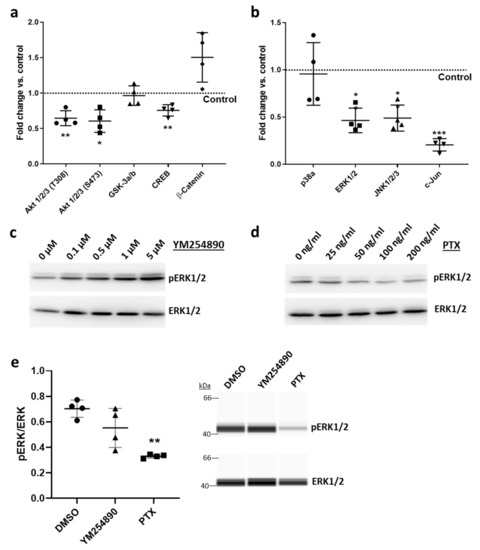 RGS5 overexpression in human VSMCs inhibits the activity of several kinases. (a,b) The phosphorylation level of different protein kinases and some of their targets in HUASMCs overexpressing GFP (Control) or RGS5 was assessed by applying a protein kinase profiler array (* p < 0.05, ** p < 0.01, *** p < 0.001 vs. Control, n = 4). (c–e) Immunoblot-based analyses of ERK1/2 phosphorylation (pERK1/2) in HUASMCs treated with either Gαq/11 inhibitor (YM254890) or Gαi/o inhibitor (Pertussis Toxin, PTX) for 24 h. (c,d) Concentration-dependent effect of YM254890 and PTX on ERK1/2 phosphorylation. (e) Capillary electrophoresis-based immunodetection of pERK1/2 and ERK1/2 in HUASMC after 24 h treatment with 2 µM of YM254890 and 200 ng/mL of PTX, respectively (** p < 0.01 vs. DMSO solvent control, n = 4).