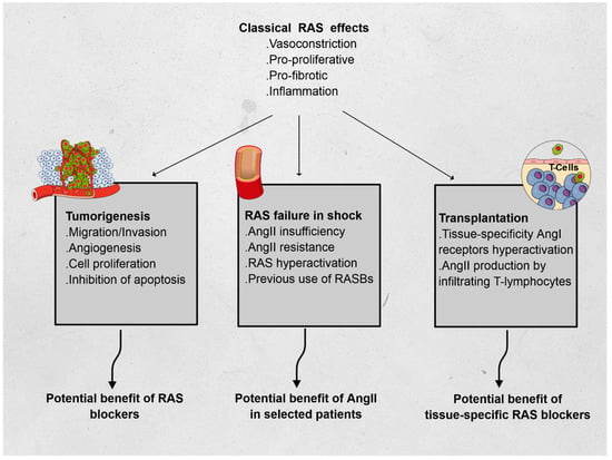While overly simplified, inflammation may be associated with an increased risk of transplant rejection, and, hence, it can constitute a legitimate therapeutic target in transplant recipients [181]; however, the lack of selective RAS inhibitor, capable of distinguishing between local target allograft vasculature and systemic use, precludes, for now, relevant therapeutic options, other than usual RASB, for which studies may only yield overall net effects of systemically blocking RAS.