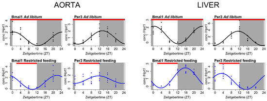 As the timing of food intake may alter the circadian molecular clock in the peripheral tissues, we dissociated lighting and feeding inputs by restricting the food only to be available at the daytime, which is the habitual inactive time period for the nocturnal rat. Then, we examined again the expression profiles of the core circadian clock genes in the aorta after 4 weeks of restricted feeding. The liver was examined as a control organ. The liver is a classic example of an organ entrained primarily by food cues rather than light input to the retina [5,84]. Feeding restricted to the inactive phase markedly shifted the phase of the internal circadian clock in the liver (Figure 2). In contrast, the circadian clock in the aorta performed very robustly and was unaffected by the changing feeding pattern (Figure 2).