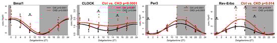 Disturbed expression of circadian clock genes in the uremic aorta after 8 weeks of CKD. Expression profiles of the core circadian clock genes in the aorta after 8 weeks of uremia (red lines) (n = 44) are compared to the normal controls (black lines) (n = 39). Dots represent each animal. Data are fitted by Cosinor regression, and the resulting p-values are shown within the figures. Gray areas indicate the dark period, and white areas indicate the light period. Zeitgeber time (ZT; “time-giver”) is the time since light onset. A significant difference in the Mesor (rhythm-adjusted mean) is indicated on top of the single figures. * Indicates a significant difference (p < 0.05) between the groups at specific time points. Data were previously presented in reference [48] and reprinted with permission from Kidney Int.