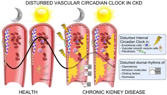 Chronic kidney diseases are associated with extremely high cardiovascular mortality, which is related to the burden of vascular calcification [42,43]. Alterations in endothelial cells, vascular smooth muscle cells (VSMC) and periarterial cells in CKD are linked to disturbed mineral homeostasis, accelerated senescence, uremic toxins, oxidative stress, abnormal lipid metabolism and chronic inflammation [42,44,45,46]. Understanding the importance of the disrupted circadian rhythmicity for the pathophysiology of uremic vasculopathy is emerging [47,48].