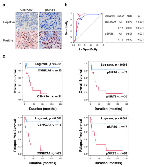 Immunohistochemical expression of CSNK2A1 and pSIRT6 in human osteosarcoma and statistical and survival analysis in osteosarcoma. (a) Negative and positive examples of immunohistochemical expression of CSNK2A1 and pSIRT6 in human osteosarcoma tissue. (b) The cut-off points of CSNK2A1 and pSIRT6 expression were determined using receiver operating characteristic curve analysis. The cut-off points of the immunohistochemical staining score for CSNK2A1 and pSIRT6 were twelve for both marker, and were determined at the point with the highest area under the curve (AUC). The red arrow (CSNK2A1) and blue arrow (pSIRT6) indicate the cut-off points. (c) Kaplan–Meier survival curves for overall survival and relapse-free survival according to the expression of CSNK2A1 and pSIRT6 in 37 osteosarcoma patients.