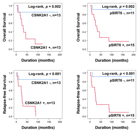 Kaplan–Meier survival curves for overall survival and relapse-free survival according to expression of CSNK2A1 and pSIRT6 in 26 osteosarcoma patients who received adjuvant chemotherapy.