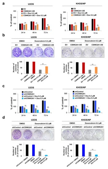 In human osteosarcomas, especially in the patients who received adjuvant chemotherapy, the expression of CSNK2A1 was significantly associated with shorter survival. Therefore, we evaluated the effect of CSNK2A1 in doxorubicin cytotoxicity on osteosarcoma cells. In U2OS and KHOS/NP osteosarcoma cells, the overexpression of CSNK2A1 did not affect the proliferation of cells (Figure 3a,b). However, under doxorubicin treatment, the overexpression of WT-CSNK2A1 attenuated the anti-proliferative effect of doxorubicin (Figure 3a,b). Under doxorubicin treatment, the cellular proliferation of CSNK2A1-overexpressing cells was significantly higher than the cells transfected with empty vector (Figure 3a,b). In contrast, the knock-down of CSNK2A1 sensitized U2OS and KHOS/NP osteosarcoma cells to doxorubicin in the CCK8 assay and colony-forming assay (Figure 3c,d). The proliferation of osteosarcoma cells that had a knock-down of CSNK2A1 was significantly lower compared with cells transfected with empty vector under treatment with doxorubicin (Figure 3c,d).