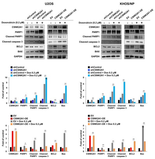 CSNK2A1 involvement in the apoptotic effects of doxorubicin in osteosarcoma cells with western blot analysis. U2OS and KHOS/NP osteosarcoma cells were transfected with control shRNA, shRNA for CSNK2A1, empty vector, or wild-type CSNK2A1 and treated with 0.2 μM doxorubicin. The expression patterns of CSNK2A1, PARP1, cleaved PARP1, cleaved caspase 3, BCL2, BAX, and GAPDH were determined via Western blot. The density of the Western blot bands was measured in triplicate by using ImageJ software. *; p < 0.05, **; p < 0.001.