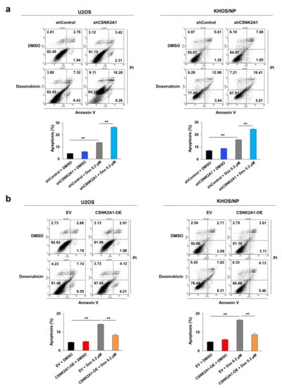 CSNK2A1 involvement in the apoptotic effects of doxorubicin in osteosarcoma cells with flow cytometry analysis. (a) U2OS and KHOS/NP osteosarcoma cells were transfected with control shRNA or shRNA for CSNK2A1 and treated with 0.2 μM doxorubicin for 24 h. (b) U2OS and KHOS/NP osteosarcoma cells were transfected with empty vector or wild-type CSNK2A1 and treated with 0.2 μM doxorubicin for 24 h. The apoptosis of cells was evaluated via flow-cytometry analysis with staining with propidium iodide and for annexin V. **; p < 0.001.