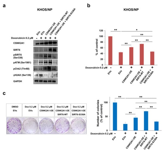 When U2OS and KHOS/NP osteosarcoma cells were treated with doxorubicin, the expression of pSIRT6, pATM, pChk2, and γH2AX were increased (Figure 6). In addition, under treatment with doxorubicin in U2OS and KHOS/NP cells, the knock-down of CSNK2A1 decreased the expression of pSIRT6, pATM, and pChk2, and the overexpression of CSNK2A1 increased the expression of pSIRT6, pATM, and pChk2 (Figure 6). The expression of γH2AX increased with the knock-down of CSNK2A1 and decreased with the overexpression of CSNK2A1 (Figure 6). Based on the role of CSNK2A1 on the phosphorylation of SIRT6 on Ser338 [10] and the role of SIRT6 on the induction of the DNA damage repair pathway [21], we evaluated the effect of a mutation of the Ser338 phosphorylation site of SIRT6 on the CSNK2A1-mediated activation of the DNA damage repair pathway triggered by treatment with doxorubicin. The overexpression of WT-CSNK2A1 or WT-CSNK2A1/WT-SIRT6 increased the expression of pSIRT6, pATM, and pChk2 and decreased the expression of γH2AX with doxorubicin treatment in KHOS/NP cells (Figure 7a). However, despite the overexpression of CSNK2A1, the transfection of the SIRT6-S338A mutant decreased the expression of pSIRT6, pATM, and pChk2, which were induced by doxorubicin and the overexpression of CSNK2A1 (Figure 7a). In CCK8 and colony-forming assays, cells overexpressing WT-CSNK2A1 or WT-CSNK2A1/WT-SIRT6 were resistant to doxorubicin, and the resistance to doxorubicin was attenuated with the transfection of the SIRT6-S338A mutant (Figure 7b,c). The number of cells and colonies were significantly decreased in the cells transfected with the SIRT6-S338A mutant compared with the cells overexpressing WT-CSNK2A1 or WT-CSNK2A1/WT-SIRT6 under treatment with doxorubicin (Figure 7b,c).