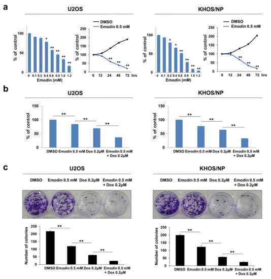 Based on the role of CSNK2A1 in resistance to doxorubicin, we evaluated the effects of emodin, a CSNK2A1 inhibitor, on osteosarcoma cells. Treatment with emodin inhibited the proliferation of U2OS and KHOS/NP cells in a dose- and time-dependent manner (Figure 9a). As shown in Figure 3, the knock-down or overexpression of CSNK2A1 did not affect the proliferation of osteosarcoma cells without doxorubicin treatment. However, in contrast, emodin showed significant anti-proliferative effects with 24 h of treatment at a 0.4 mM concentration (Figure 9a). Moreover, similar to when cells underwent a knock-down of CSNK2A1, 0.5 mM emodin treatment potentiated the cytotoxic effects of doxorubicin (Figure 9b,c). Co-treatment with emodin and doxorubicin significantly inhibited the proliferation of U2OS and KHOS/NP cells compared with treatment with either doxorubicin or emodin alone (Figure 9b,c).
