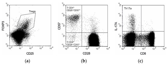 T subpopulations gating strategy. (a) Regulatory T cells gated on CD4+ T lymphocytes; (b) CD28-negative subpopulations gated on CD4+ T lymphocytes; (c) Th17a cells gated on T lymphocytes.