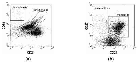 B cells are traditionally regarded as promoters of the immune response due to their capacity to produce antibodies and release a broad variety of cytokines. However, recent studies in B cell biology have also demonstrated that one functional B cell subset, regulatory B cells (Bregs), contributes to the maintenance of the proper immune balance. The most commonly used characterization of Breg cells was established by Blair et al. who identified CD19+CD24++CD38++ lymphocytes as B cells with regulatory properties []. Human B cells with regulatory functions have been described within the CD24++CD38++ transitional B cell subset []. IL-10 production is also considered to be a hallmark of Bregs []. Bregs restrain the excessive inflammatory responses that occur during autoimmune diseases or are caused by the exposure to various infectious factors []. Some of the activated B cells develop into extrafollicular plasmablasts and early memory B cells in the extrafollicular pathway []. Plasmablasts derived from the B cell lineage encompass a stage intermediate between activated B cells and plasma cells. Plasmablasts are generally rare in the peripheral blood of healthy individuals [] and could be chronically elevated in persistent immune responses such as in chronic autoimmune diseases [,,,].