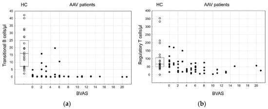 Transitional B cells and regulatory T cells and their relation to the AAV disease and its activity; ○—HC, box—IQR, line—median, ●—AAV. (a) Transitional B cells—HC vs. AAV, p < 0.001; correlation with the BVAS, rs = −0.35, p = 0.009. (b) Regulatory T cells ― HC vs. AAV, p < 0.001; correlation with the BVAS, rs = −0.43, p < 0.001.