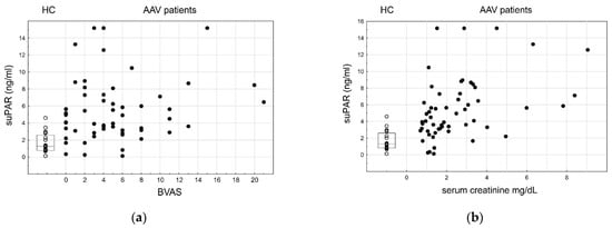 SuPAR plasma level and its relation to the AAV disease (suPAR HC vs. AAV, p < 0.001), its activity and the serum creatinin concentration; ○—HC, box—IQR, line—median, ●—AAV. (a) Correlation of the suPAR plasma level in AAV with the BVAS, rs = 0.11, p = 0.406. (b) Correlation of the suPAR plasma level in AAV with serum creatinine, rs = 0.43, p < 0.001.