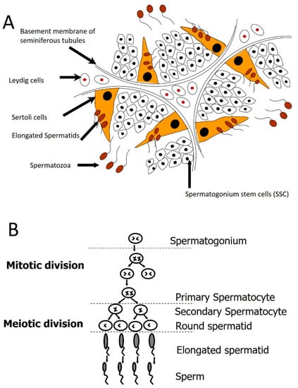 The process of spermatogenesis. (A) A cross-section in the testis, showing the process of spermatogenesis occurring in the seminiferous tubules with the aid of Sertoli cells. (B) After puberty, spermatogonial stem cells proceed into infinite mitotic and meiotic divisions resulting in millions of spermatozoa [97].