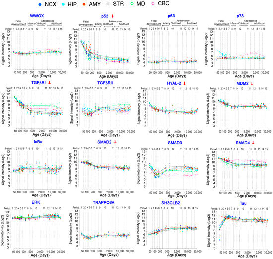 We selected 16 WWOX-related gene expression data from the Human Brain Transcriptome (https://hbatlas.org/pages/hbtd; last visit on 25 June 2021) [85,86]. Brain areas examined for gene expression are cerebellar cortex (CBC), mediodorsal nucleus of the thalamus (MD), striatum (STR), amygdala (AMY), hippocampus (HIP), and 11 areas of neocortex (NCX). Notably, the expression of p53 and MDM2 genes are downregulated after birth and the reduction continues in teenage (Figure 2; red arrow). The reduction in gene expression also occurs in MDM2, Hyal-2, Smad3, Smad4, and TGFβRI (Figure 2; red arrows). The levels of other listed gene expression are not downregulated and relatively stable. In the IκBα/WWOX/ERK survival signaling [54], no reduction of gene expression for IκBα, WWOX, and ERK is shown from prenatal to the teenage period. No reduction for WWOX and TGFβRII genes for signaling cell–cell recognition is shown [47]. No downregulation of TRAPPC6A, SH3GLB2 and tau is shown up to the teenage period.