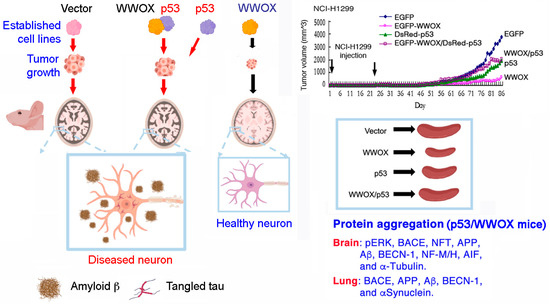 p53 may functionally antagonize the biological functions of WWOX in vivo. Four stable transfectants of NCI-H1299 cells with vector only, WWOX, p53, or WWOX/p53 mammalian expression vectors, were established [76]. Subcutaneous inoculation of these established cells in nude mice revealed that WWOX is most effective in cancer suppression and inhibition of inflammation (splenomegaly), as compared to p53 [76]. p53 inhibits the effect of WWOX in blocking cancer growth. Protein aggregates, including pERK, BACE, APP, Aβ, NFT, and α-tubulin, are found in the brains of p53/WWOX-NCI-H1299 mice, but not in other mice. Protein aggregates in the lung are also observed.