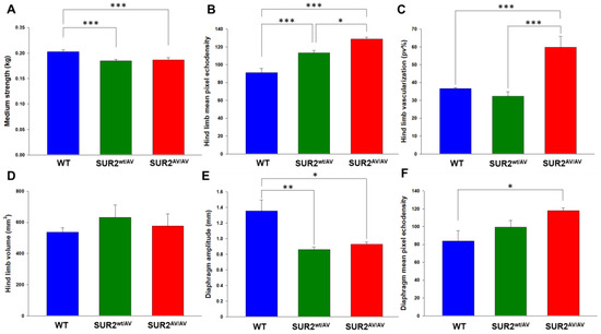 In vivo evaluation of skeletal muscle morphology and functionality (n. animal used for these evaluations: 4 animals per genotype). (A) Medium forelimb strength was 0.203 ± 0.003 kg in WT mice (n. measurements = 16), 0.185 ± 0.003 in SUR2wt/AV kg mice (n. measurements = 21) and 0.191 ± 0.005 kg in SUR2AV/AV mice (n. measurements = 20), respectively. In ultrasound evaluation, (B) the mean pixel echodensity for the hind limb was 91.2 ± 4.7 in WT mice, 113.4 ± 2.4 in SUR2wt/AV mice and 128.7 ± 2 in SUR2AV/AV mice. (C) Percentage of hind limb vascularization was 36.6 ± 0.6% in WT mice, 32.3 ± 2.5% in SUR2wt/AV mice and 59.8 ± 6.2% in SUR2AV/AV mice. (D) Hind limb volume was 536.7 ± 29.2 mm3 in WT mice, 630.8 ± 79.9 mm3 in SUR2wt/AV mice and 575.8 ± 77.8 mm3 in SUR2AV/AV mice. (E) Diaphragm amplitude was 1.35 ± 0.14 mm in WT mice, 0.86 ± 0.04 mm in SUR2wt/AV mice and 0.93 ± 0.03 mm in SUR2AV/AV mice. (F) The mean pixel echodensity for the diaphragm was 84 ± 11.4 in WT mice, 99.3 ± 7.5 in SUR2wt/AV mice and 118 ± 2.8 in SUR2AV/AV mice. Data are presented as mean ± SEM. Data significantly different as evaluated with one-way ANOVA and Bonferroni test (*** p < 0.001, ** p < 0.005, * p < 0.05).