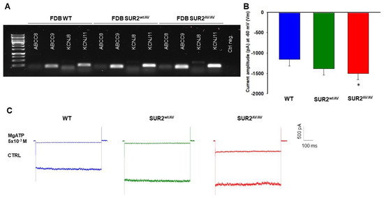 Channel subunits expression and current amplitude distribution in FDB fibers at physiological membrane voltage of −60 mV (Vm). (A) Sample gel of PCR analysis in an FDB muscle: high levels of expression of ABCC9 and KCNJ11 genes, encoding respectively for SUR2 and Kir6.2, were found in all the phenotypes. (B) In inside-out patch-clamp experiments on FDB isolated fibers, the calculated mean was −1152.8 ± 164 pA for WT, −1381.2 ± 155.5 pA for SUR2wt/AV mice and −1499.2 ± 151.7 pA for SUR2AV/AV mice (n. patches = 20, 38, 45 from 3 muscles/3 mice per genotype, respectively); * data significantly different as evaluated with one-way ANOVA and Bonferroni test for p < 0.05. (C) Sample traces of recorded KATP currents, illustrating a tendency toward increased current amplitude in FDB fibers from SUR2wt/AV and SUR2AV/AV mice with respect to WT but more marked reduction of sensitivity to 5 × 10−3 M MgATP.