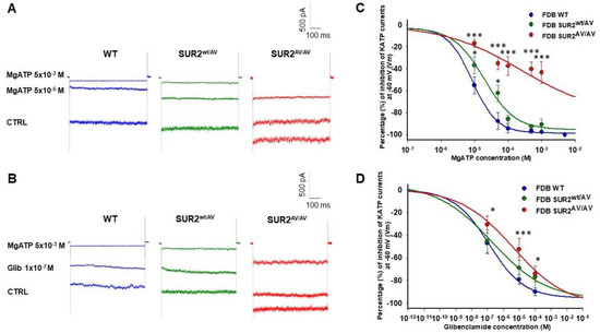 MgATP- and glibenclamide-sensitivity of KATP currents in FDB fibers. (A) Sample traces of currents in zero (CTRL), 5 × 10−5 M and 5 × 10−3 M MgATP in FDB isolated fibers from WT, SUR2wt/AV and SUR2AV/AV mice. (B) Sample traces of currents in zero (CTRL), 10−7 M glibenclamide (Glib) and 5 × 10−3 M MgATP in FDB fibers from WT, SUR2wt/AV and SUR2AV/AV mice (n. patches = 30, 48, 55 from 3 muscles/3 mice per genotype, respectively). (C,D) Sensitivity to inhibition by MgATP (C) or Glib (D) in FDB patches from WT, SUR2wt/AV and SUR2AV/AV mice. Data were fitted using the Hill equation (see Table 1). Each experimental point represents the mean ± SEM of at least three patches. Data significantly different as evaluated with one-way ANOVA and Bonferroni test (*** p < 0.001, * p < 0.05).