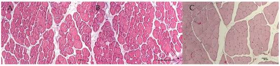 An autopsy with macroscopic observation of all organs was performed among the sacrificed subjects according to approved protocols [29]. After animal sacrifice, tissue samples were incorporated, frozen in liquid nitrogen at −80 °C, sectioned using a cryostat for ATPase and succinodehydrogenase (SDH) staining. Other samples were fixed with 10% animal buffered formalin for a minimum period of 72 h. Tissues were embedded in paraffin; sections were cut to 5 μm and stained with standard techniques with hematoxylin and eosin (H.E.), Mallory’s trichrome stain and Schiff’s periodic acid (PAS). Digital images were taken from the cross section at 10–100× magnification to assess muscle fiber morphology and to determine fiber cross-sectional area (CSA) measurements. Images from 20 random fields were acquired for the ten stained sections of each sample using a Leica DMLS D 4000 microscope equipped with an Elements-BR-Nikon NIS camera and image analyzer. Section analysis and CSA evaluation of the fibers were performed by QWin software (3.1.0, Leica, Wetzlar, Germany) on 53 cells per muscle section. Examination of cell morphology and intracellular structures was conducted, and the severity of lesions observed was assessed [30] by an animal pathologist blinded to the mouse genotype. At least 2 SOL, 2 TA, 2 GA and 2 EDL muscles for histopathology analysis were used from 2 different mice per genotype.