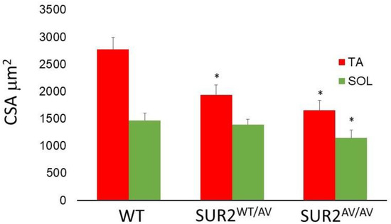 TA muscle showed even more severe atrophy, with reduced CSA of ~30% and ~40% in TA of SUR2wt/AV and SUR2AV/AV mice, respectively (Figure 6A–C, Figure 7). In the muscle TA of SUR2AV/AV mice, a heterogeneous population of myofibers with reduced area was evident, with angular atrophic fibers alongside larger, rounded and slightly hypertrophic fibers (Figure 6D,E), as well as interstices with edema and inflammatory cells (Figure 6E) (n. inflammatory cells per sections = 18 ± 4, 20×). TA muscle section of WT mice showed n. 7 ± 4 inflammatory cells per sections, 20×.