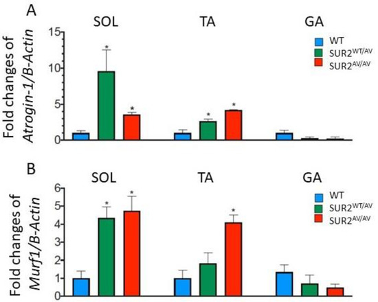 Atrogin-1 and MuRF1 gene expression in soleus (SOL), tibialis anterior (TA) and gastrocnemius (GA) of WT, SUR2wt/AV and SUR2AV/AV mice. The figure shows quantification of transcriptional level with qPCR for (A) atrogin-1 and (B) MuRF1 normalized by β-actin gene. In each graph, bars represent mean ± SEM for 3 muscles per each genotype. * Data significantly different with respect to the WT (p < 0.05).