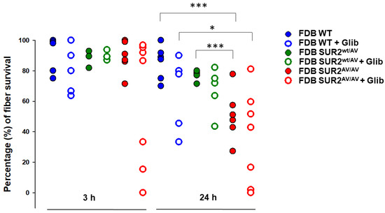 Evaluation of ex vivo survival of FDB isolated fibers from WT, SUR2wt/AV and SUR2AV/AV mice. Fiber survival was reduced at 3 h in SUR2AV/AV fibers and progressively more so in SUR2wt/AV and SUR2AV/AV at 24 h. Short-time incubation with Glib did not significantly affect fiber viability, whereas 24 h of fibers treatment with Glib further reduced fiber viability with respect to untreated fibers (n. of fibers = 100–150 for each experimental condition; fibers were collected from ≥ 3 FDB from ≥3 mice per genotype). Values of percentage of fiber survival are presented as individual data points for each repetition. Data significantly different as evaluated with one-way ANOVA and Bonferroni test (*** p < 0.001, * p < 0.05).