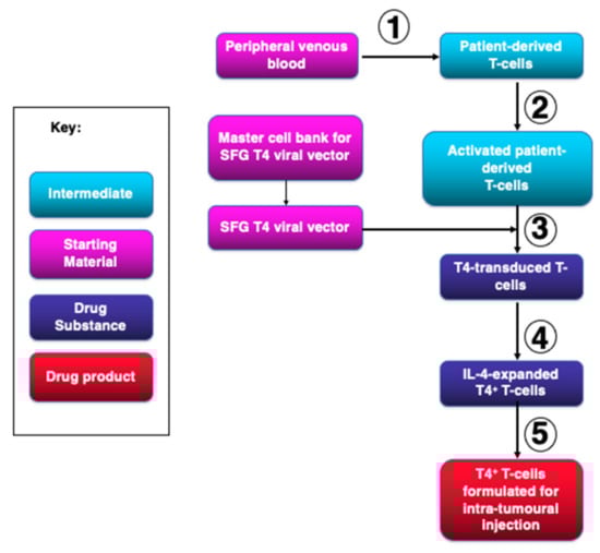 ClinicalTrials.gov number, NCT01818323; EudraCT Number: 2012-001654-25, accessed on 15 July 2021). Owing to limited capacity for leukapheresis, we opted to use whole blood as starting material. Moreover, expanded CAR T-cells were formulated as a fresh rather than a cryopreserved drug product. In the preparation of T4 immunotherapy, T-cells are engineered to express a CAR named T1E28z that directs specificity against several pathogenetically relevant ErbB dimers in HNSCC [
